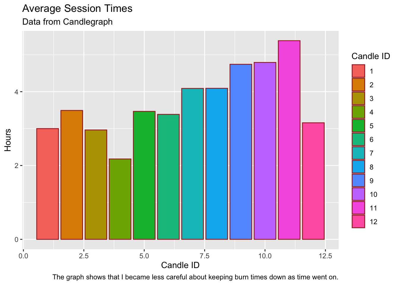 viz + labs(title="Average Session Times",subtitle="Data from Candlegraph",caption="The graph shows that I became less careful about keeping burn times down as time went on.",x="Candle ID",y="Hours",fill="Candle ID")
