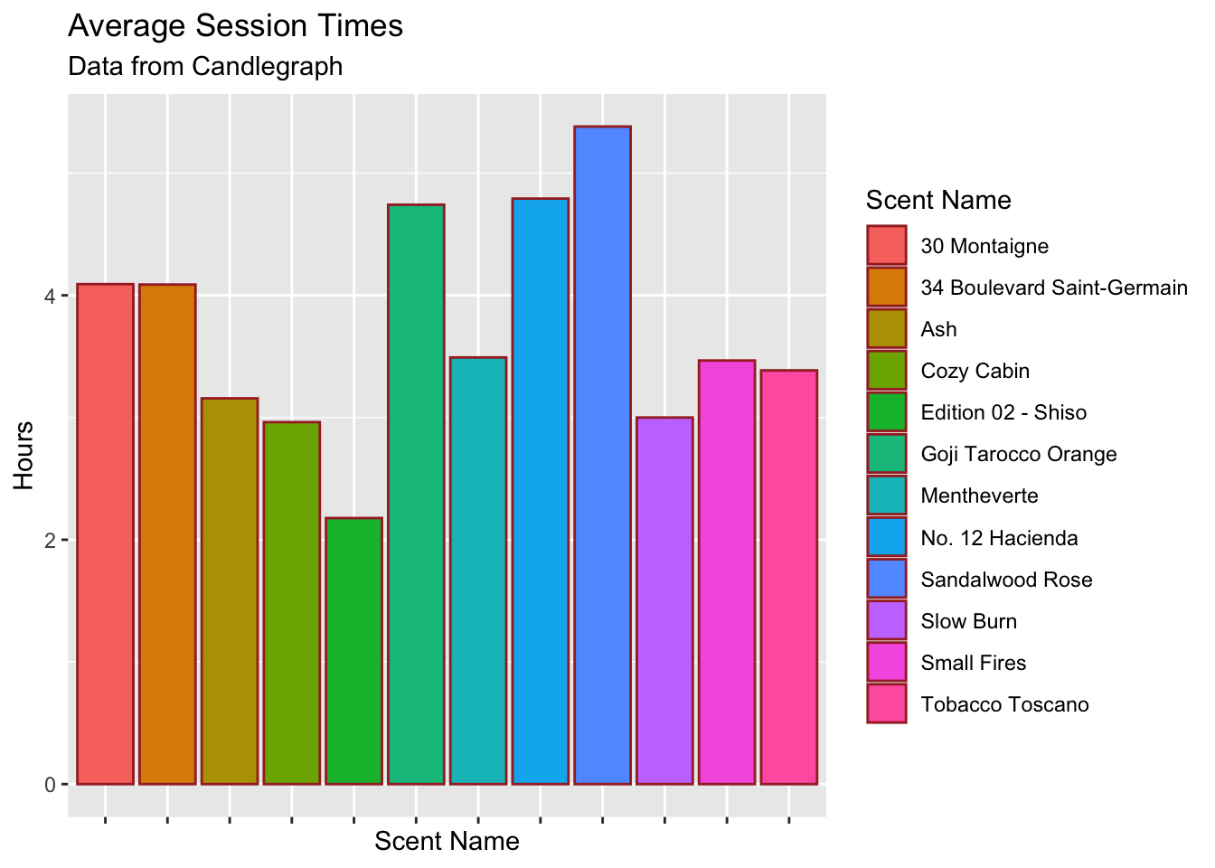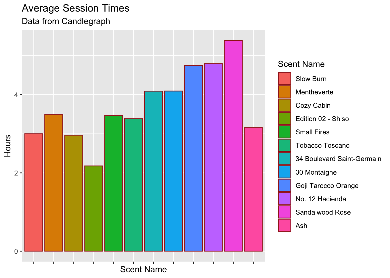 viz + labs(title="Average Session Times",subtitle="Data from Candlegraph",x="Scent Name",y="Hours",fill="Scent Name")